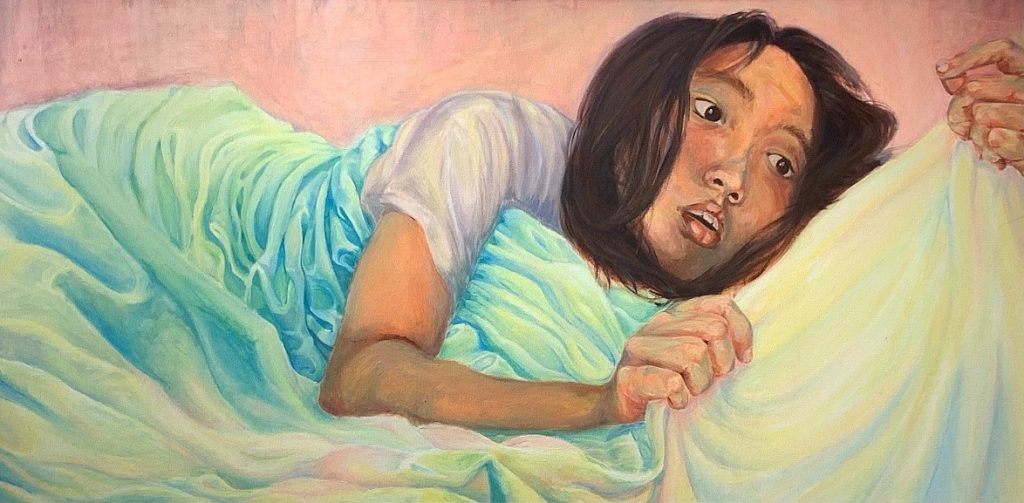 This piece aims to juxtapose the restrictiveness of dwelling and overthinking, with the liberation from seeking contentment in detaching from the past. This dichotomy is shown via the symbol of the blanket. In the painting, the folds tightly winding the body appear complex, but become simple when outstretched by a person’s decision to hold it at a distance. This idea of healthy detachment is contrasted by the depiction of spiraling within complexity in Incomprehensible Synthesis.