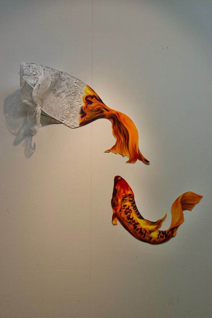 Inspired by a Chinese legend of the Koi, this piece addresses change in one’s life and its impact on those around them. The Koi’s transformation from two to three dimensionality reflects how change can be different but still just as beautiful. However, when one undergoes change alone, what of those left behind? As my grandfather steadily loses memories of us, as reflected by the transition from vibrant coloured pencils to cuts on white paper, he undergoes a transformation I cannot follow.