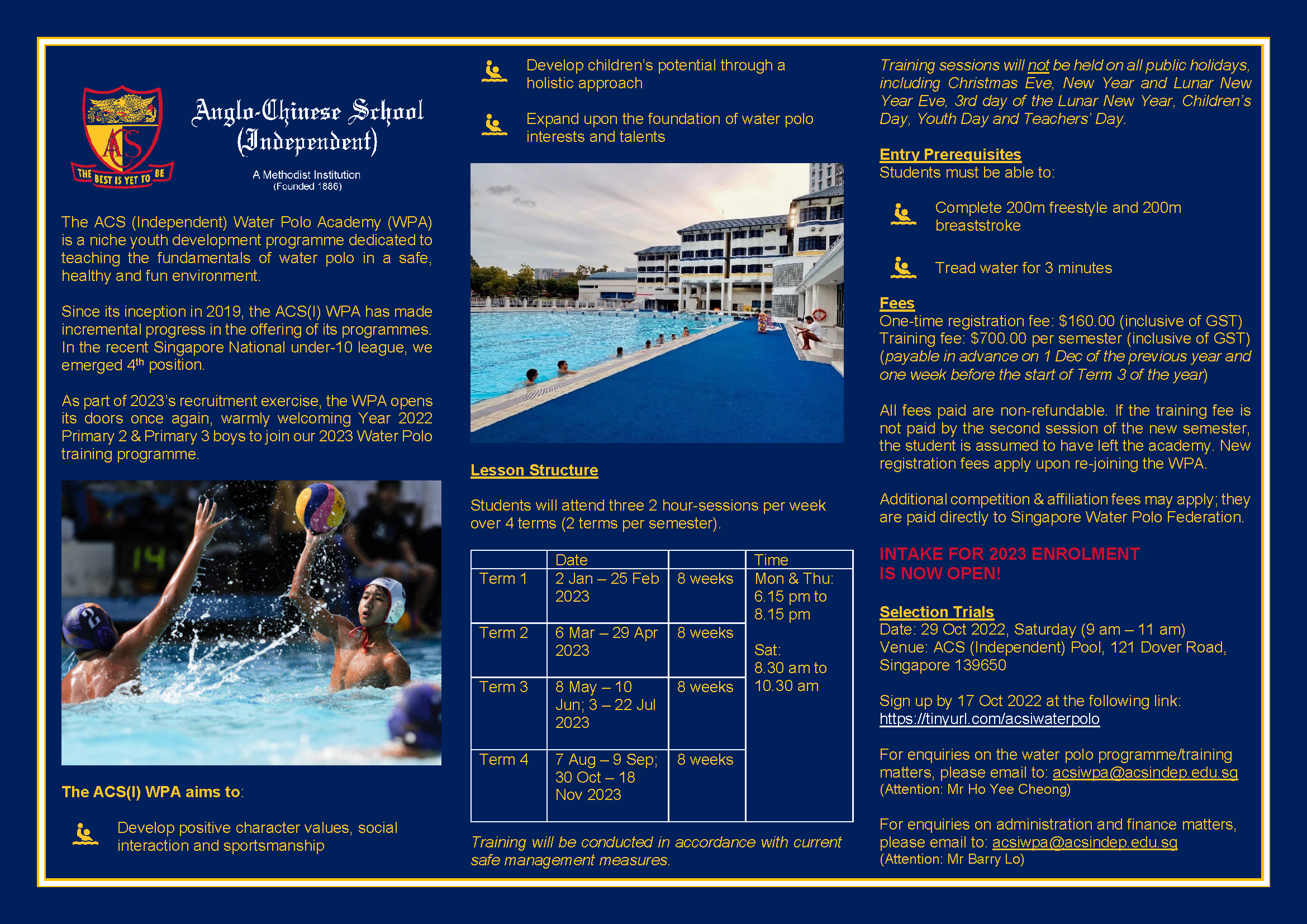 For Primary 2 or Primary 3 boys who are keen to enrol in ACS(I) WPA’s 2023 intake, you are invited to register for the Selection Trials taking place on 29 Oct (Sat) at https://tinyurl.com/acsiwaterpolo.